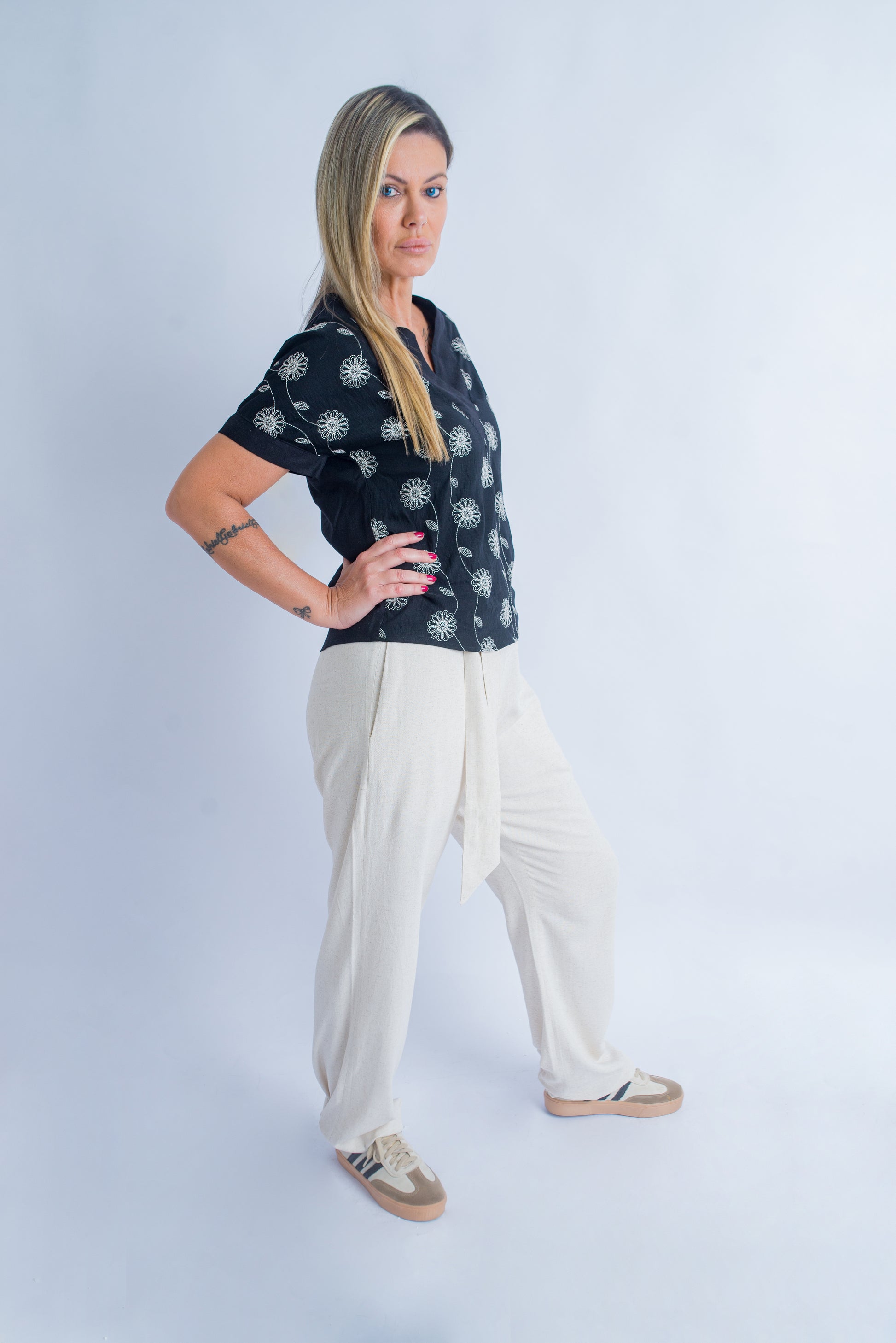 • Descrição: Calça com elástico na cintura, proporcionando conforto e vestindo bem diferentes tipos de corpos. Parte interna com acabamento em viés de cetim. Matéria-prima de alta qualidade para um toque sofisticado.• Composição: 80% linho, 18% viscose, 2% elastano.